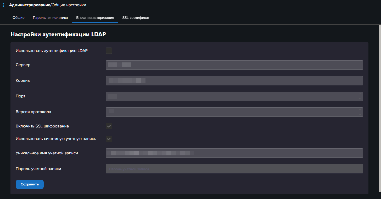 - Использовать аутентификацию LDAP - включите, если нужно использовать авторизацию через учетные записи LDAP.