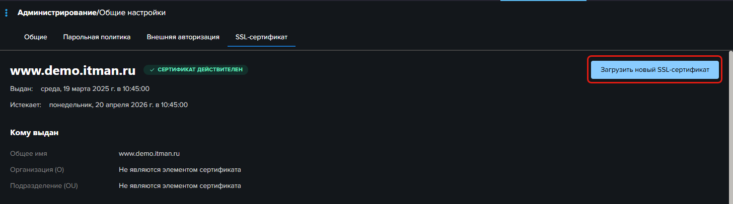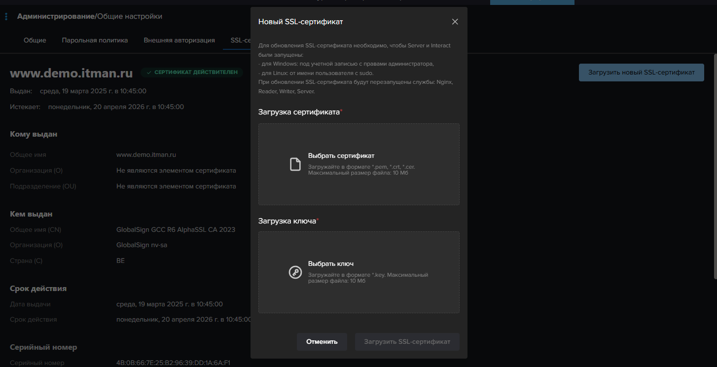 | SSL-сертификат успешно обновлен. SSL-сертификат является самоподписным, его необходимо добавить в доверенные в браузерах пользователей, работающих с системой. Подробнее смотреть в документации.  |
