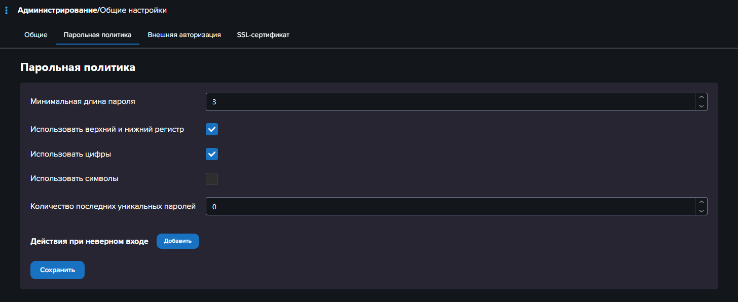 - Укажите Кол-во неудачных попыток - количество попыток авторизации, которые не завершились успешно, после которого возможность авторизации будет временно заблокирована для пользователя.