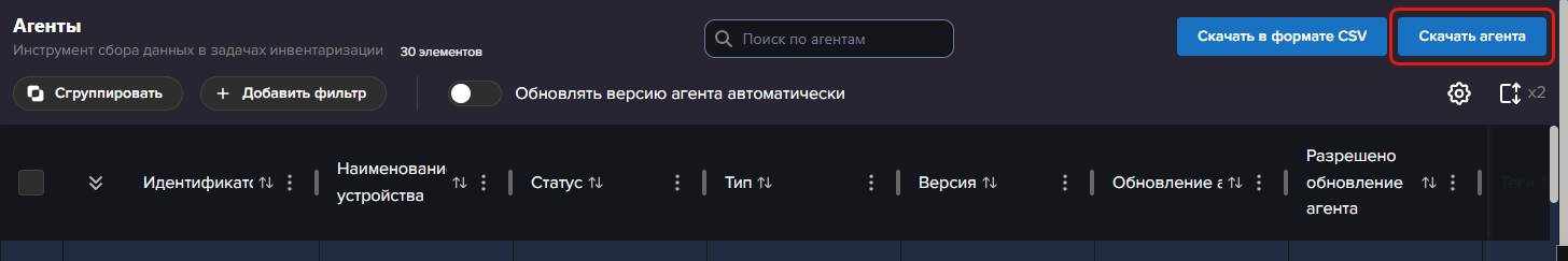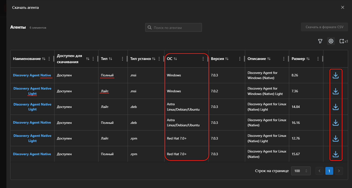 - Нажмите на название агента в таблице или иконку скачивания в строке агента, чтобы начать скачивание.