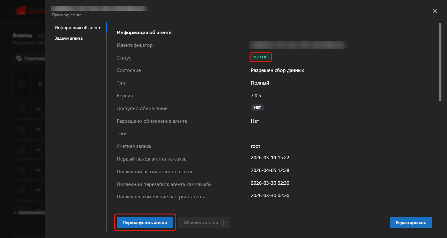 - Нажмите кнопку Перезапустить агента.