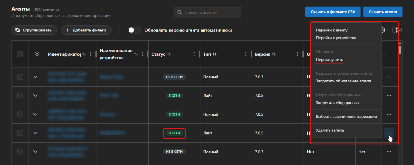 Вы также можете выполнить перезапуск агента с помощью массовых действий.