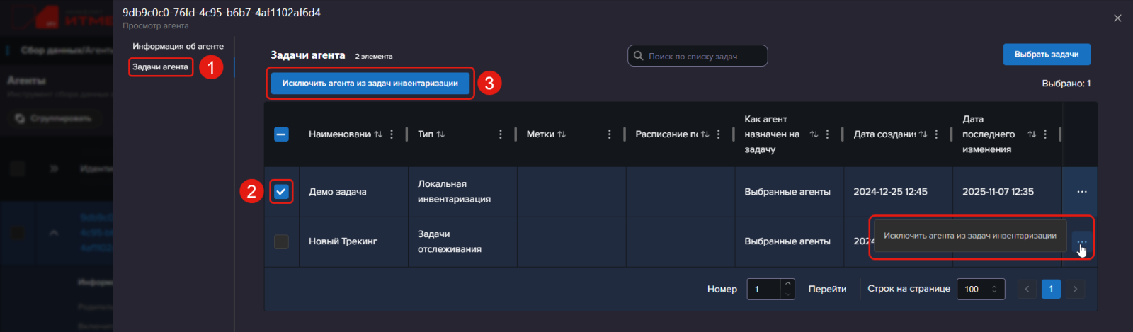 - Отметьте задачи, которые нужно снять с агента, с помощью чекбокса