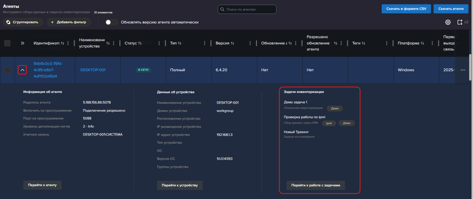 Или нажмите на идентификатор агента и перейдите на вкладку Задачи агента в его карточке.