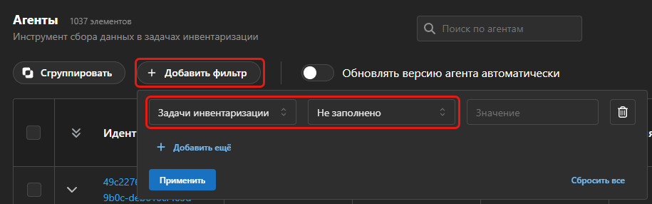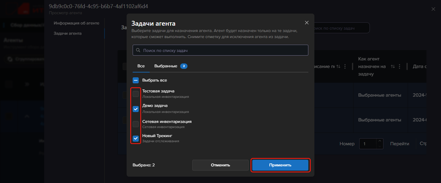 Если вы выключите чекбокс на каких-либо задачах, то агент будет отключен (добавлен в Исключенные) в данных задачах. - Нажмите кнопку Применить, чтобы сохранить изменения.