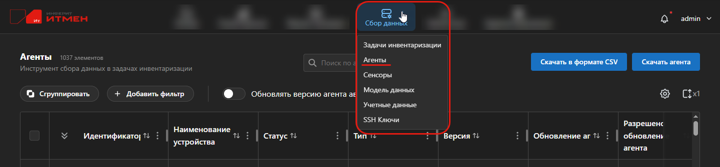 Для начала работы перейдите в раздел Сбор данных / Агенты с помощью меню.