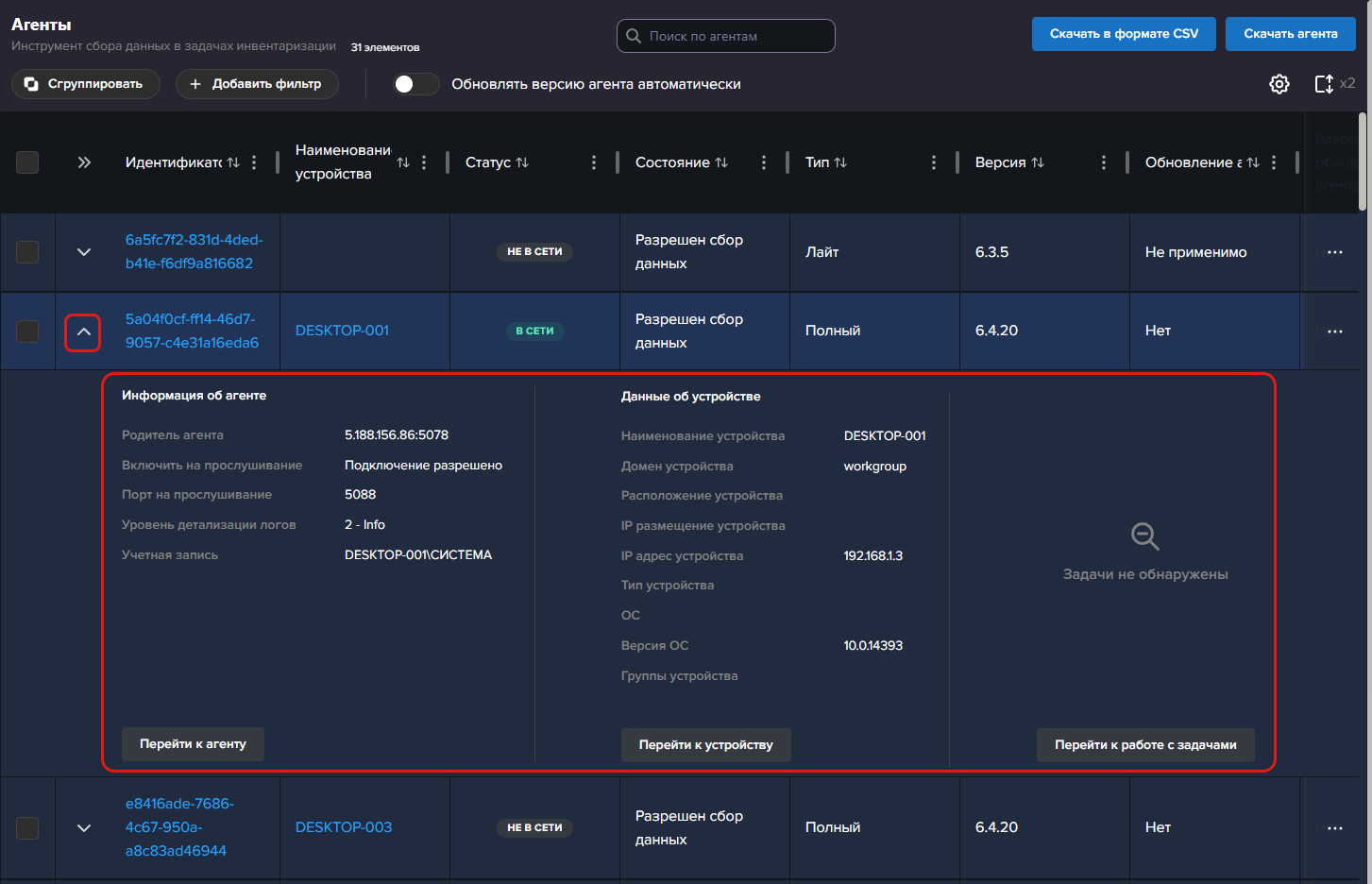 Нажмите на иконку рядом с идентификатором агента. После этого развернется дополнительная информация: