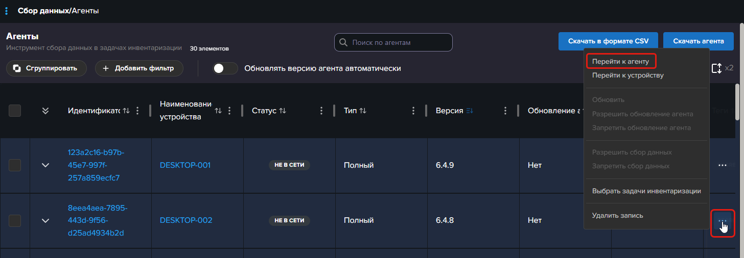Для просмотра карточки агента перейдите в раздел Сбор данных / Агенты с помощью меню.