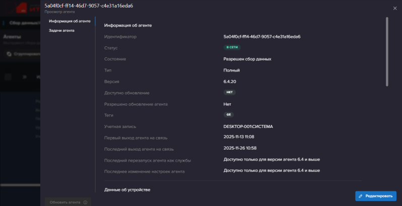 - Об устройстве - содержит данные устройства, на котором установлен агент, а также позволяет перейти к просмотру карточки устройства.