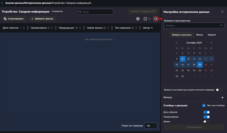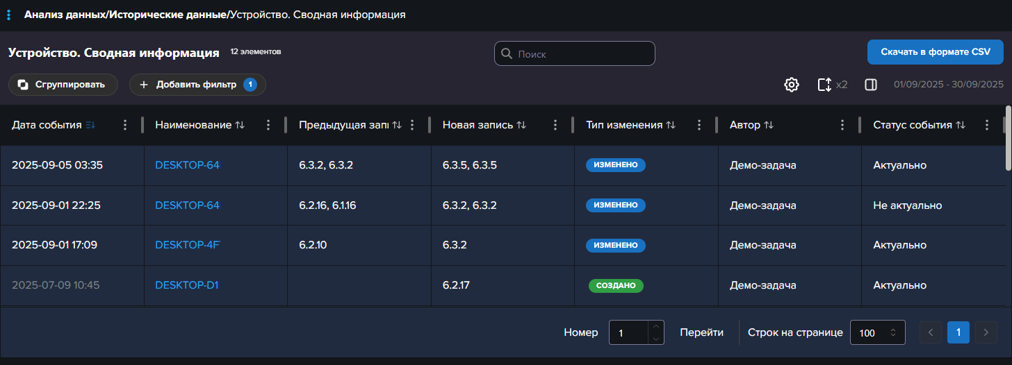 Отчет включает в себя исторические данные об изменении выбранной характеристики устройств. Изменение попадает в отчет, если произошло событие: