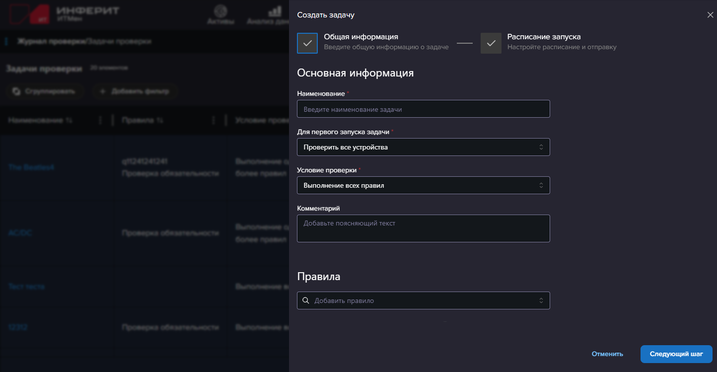 - Правила - выберите правила, выполнение которых будет проверяться в рамках задачи.