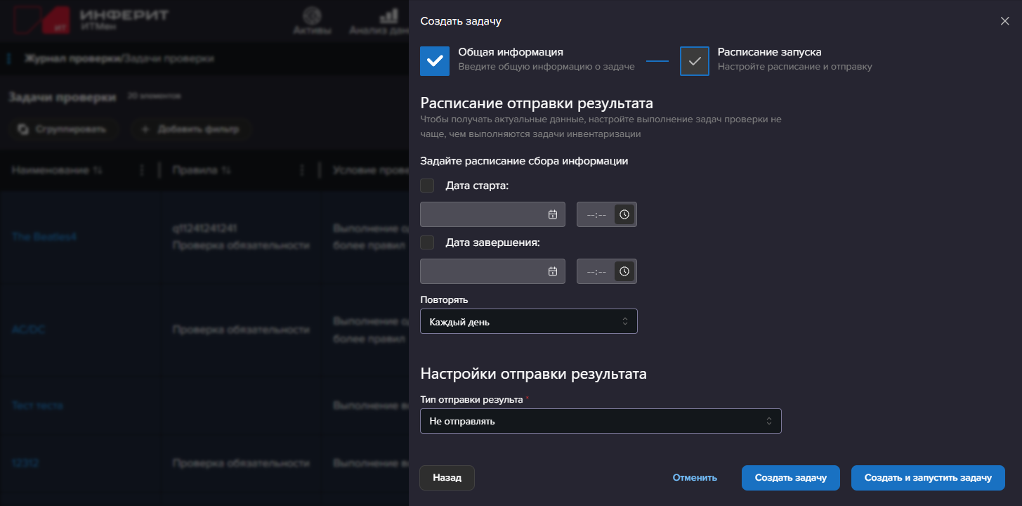 - Создать и запустить задачу - задача будет сохранена и запущена сразу после сохранения. Дальнейший запуск задачи будет производиться согласно настроенному расписанию или вручную.