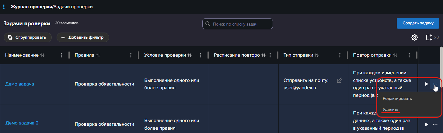 Обратите внимание, существование задачи с пустым правилом возможно, если после создания задачи с правилом оно было удалено в разделе Журнал проверки / Правила проверки. При этом при удалении был включен чекбокс Продолжать работу задачи. Если после удаления правила в задаче не осталось других правил, то такая задача не будет выполняться. Вы можете добавить в нее другое правило, или удалить задачу.