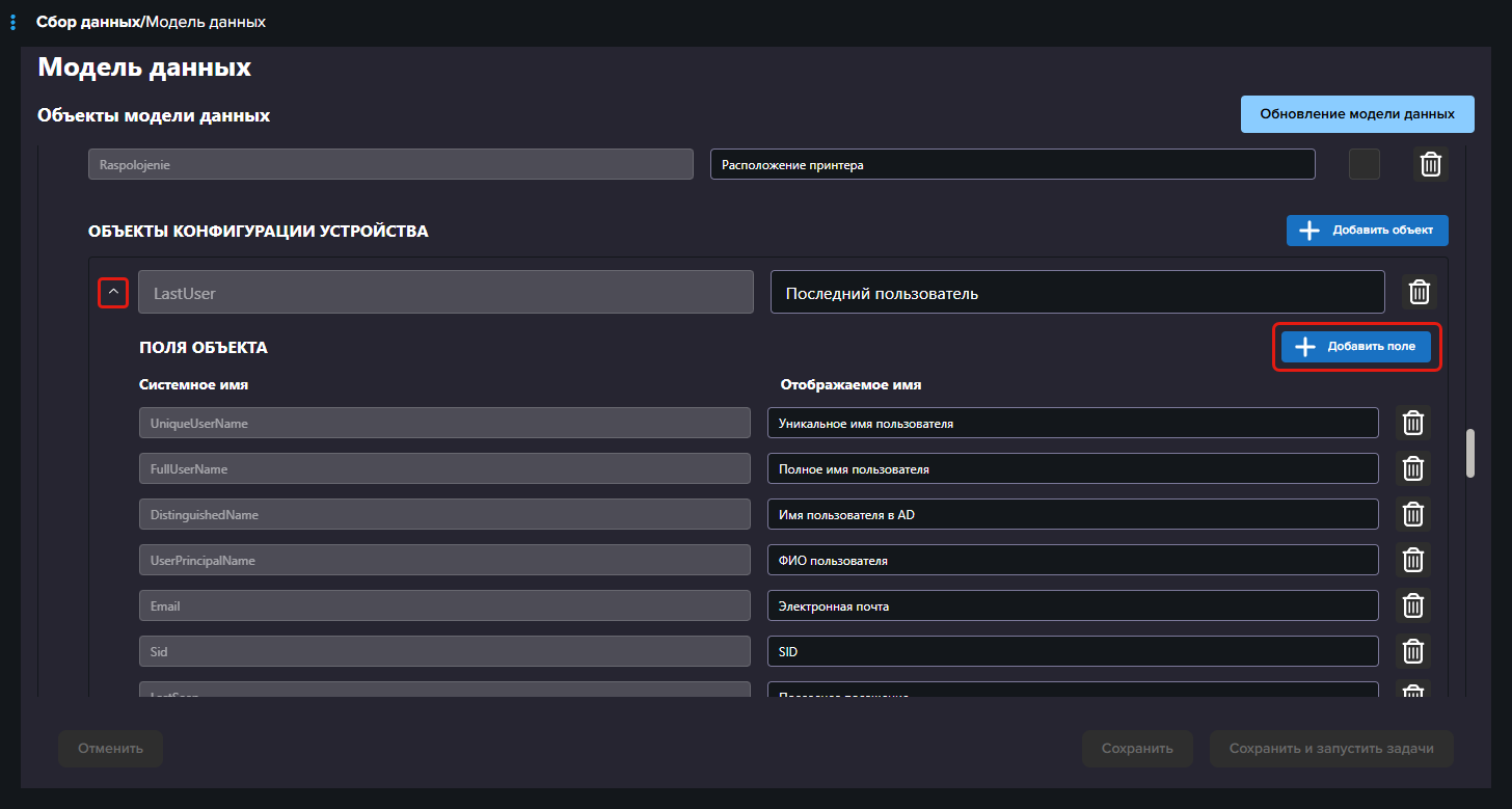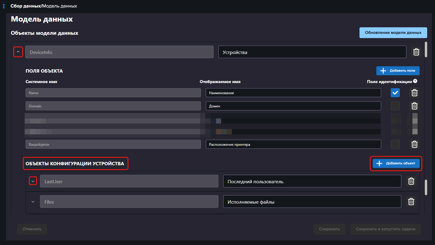 - Сохранить и запустить задачи - сохраняет изменения модели данных и принудительно запускает задачи инвентаризации.