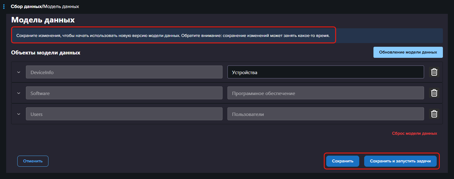 - Сохранить - сохраняет изменения модели данных, но не запускает задачи инвентаризации.