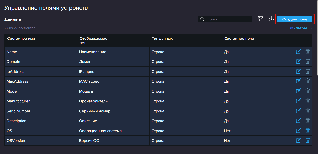С помощью справочника Поля устройств вы можете настроить список полей устройств, которые будут доступны в системе.