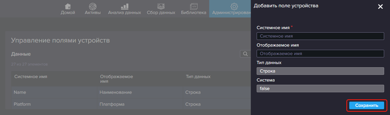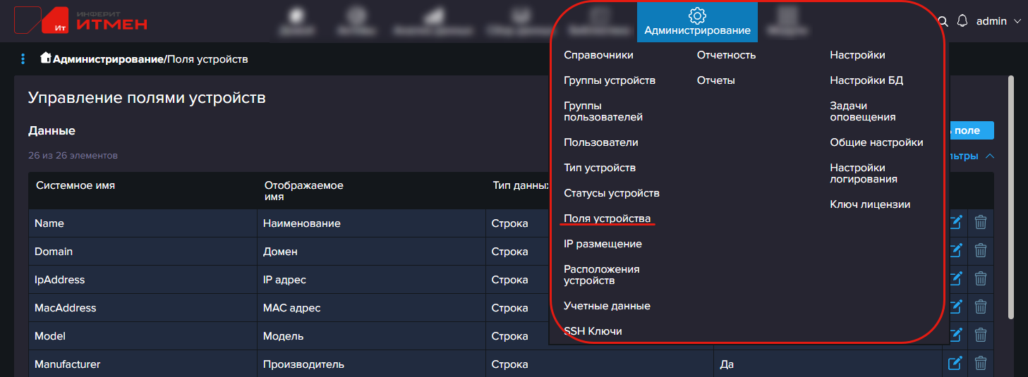 - Перейдите в раздел Администрирование / Поля устройства, как описано в начале инструкции.