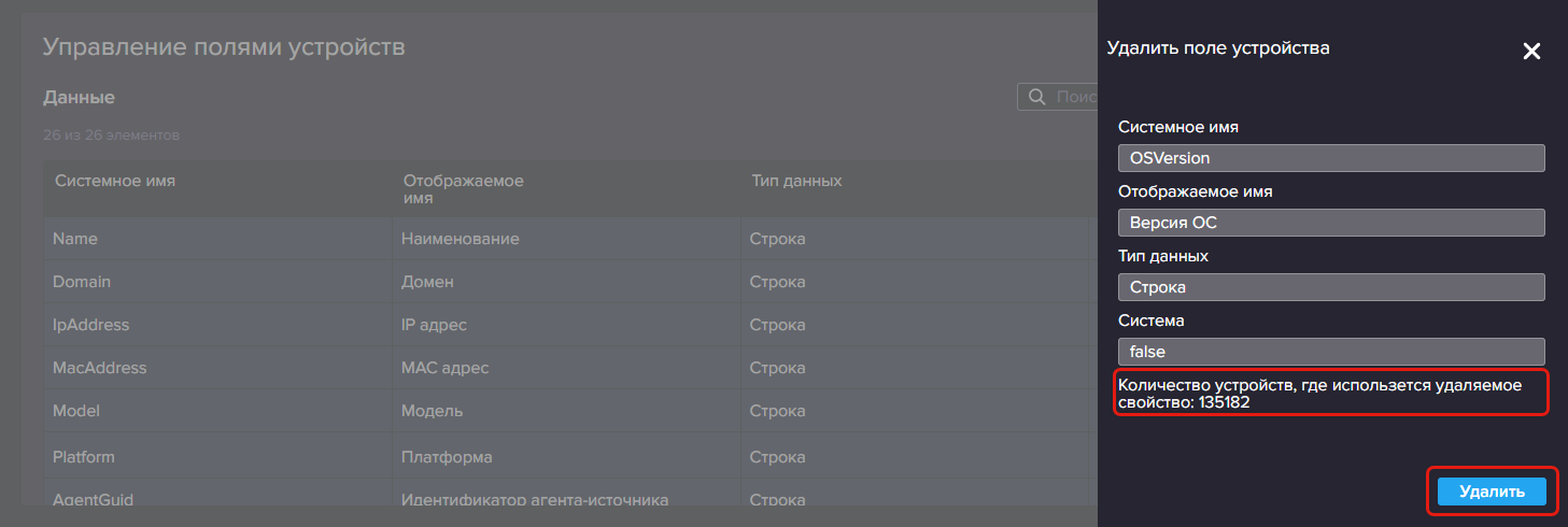 При удалении несистемного поля откроется окно подтверждения. В нем будет указано количество устройств, в которых заполнено данное поле. Подсчет устройств занимает время, дождитесь окончания проверки. Обратите внимание, при удалении поля, данные, которые были заполнены в этом поле в устройствах, будут также удалены.