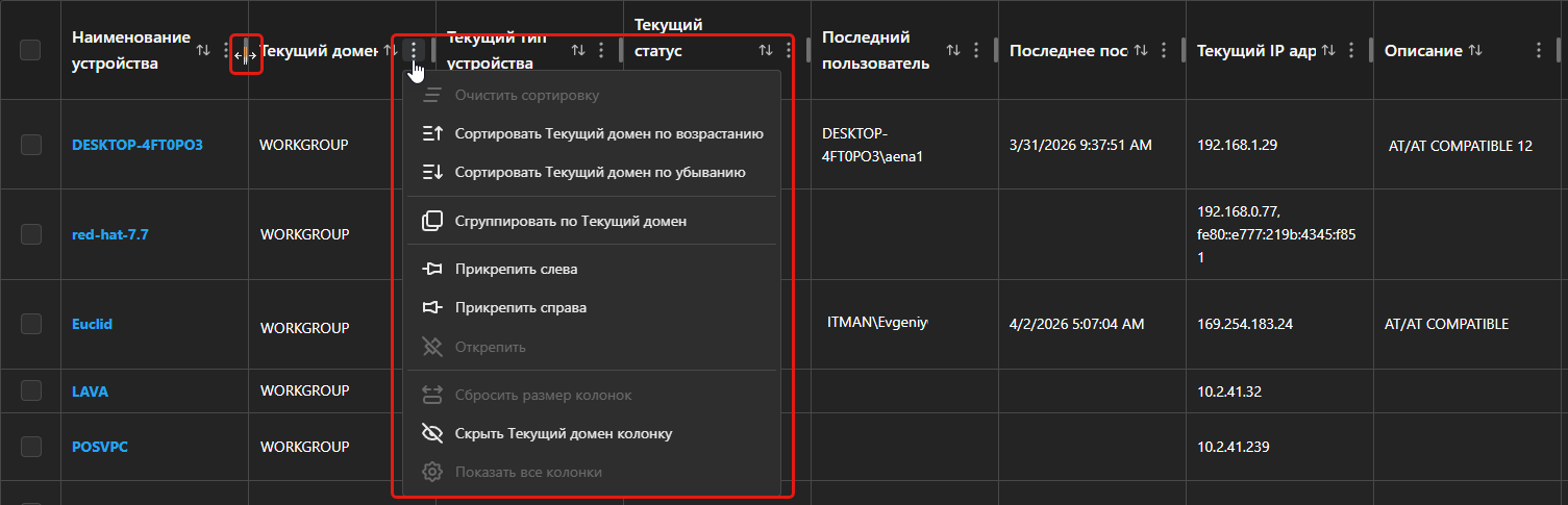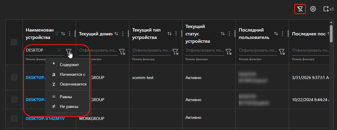 В некоторых таблицах вам доступны фильтры, которые позволяют отобразить в таблице данные, которые соответствуют определенному условию. Например, наименование устройства содержит определенное слово.