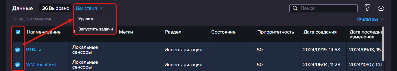 Обратите внимание, если вы используете группировку по данным столбца, то вы можете включить чекбокс напротив группы, чтобы выбрать все входящие в нее объекты. - Над таблицей появятся кнопки доступных массовых действий. Доступные действия зависят от раздела, в котором расположена таблица.