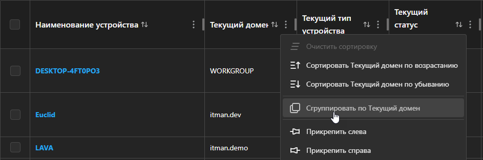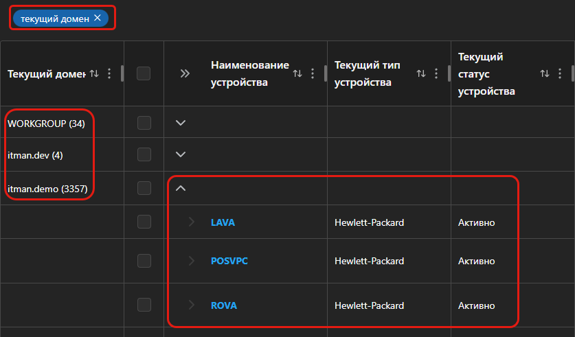 - Группы, если они предусмотрены разделом (например, группы устройств в активах)
