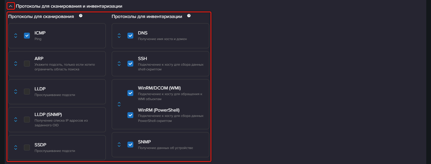 Нажмите на пункт Протоколы для сканирования и инвентаризации, чтобы раскрыть список протоколов.