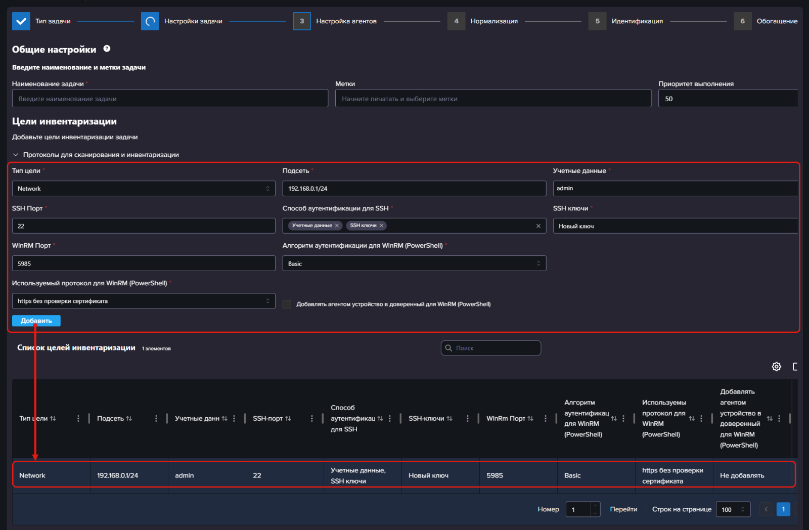 - Добавить еще одну цель. Используйте эту возможность, если требуется просканировать несколько сетей с отдельными учетными данными.