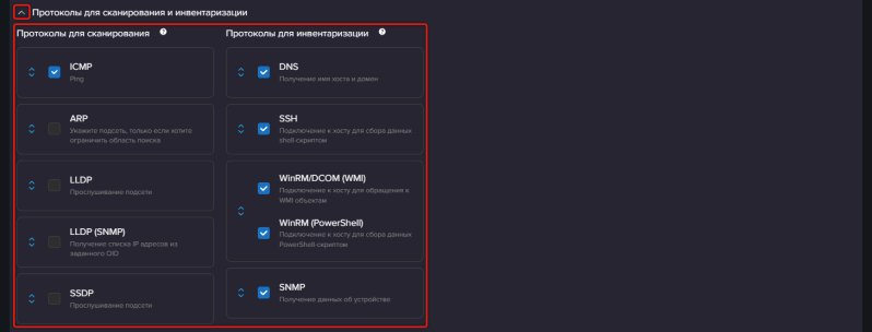 | Протоколы для сканирования - применяются для поиска устройств в сети или подключенных с помощью провода и сбора публичного набора данных об этих устройствах. Хотя бы один протокол должен быть выбран. Поддерживают все кейсы сбора данных: - агент, выполняющий задачу, установлен на Windows + сбор данных производится с ПК на Windows или на Linux. - агент, выполняющий задачу, установлен на Linux + сбор данных производится с ПК на Windows или на Linux. |