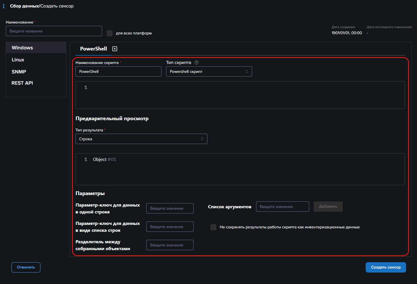 Использование сенсоров с несколькими скриптами поддерживается только задачами сбора данных инвентаризации с агента (локальный сбор) и сетевой инвентаризации.