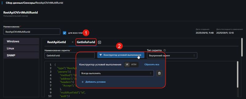 Конструктор условий выполнения позволяет вам настроить, в каких случаях нужно применять скрипт на текущей вкладке. Настройка условий доступна только для дополнительных скриптов в сенсоре. Скрипт, настроенный на первой вкладке, выполняется всегда без дополнительных условий.
