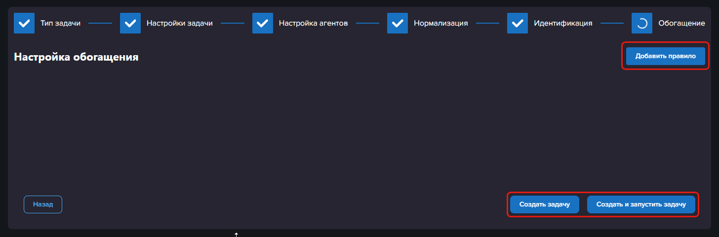 - После того, как вы создали все нужные правила обогащения, нажмите кнопку Сохранить, чтобы завершить создание задачи и запустить ее выполнение.
