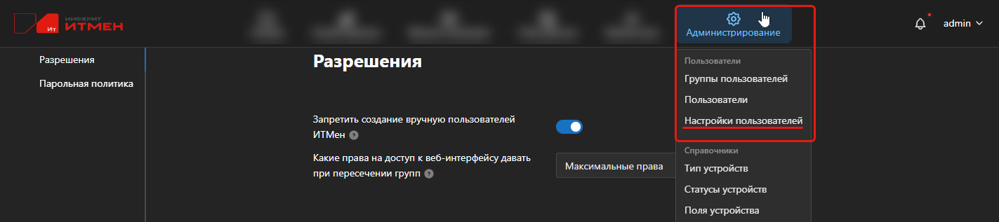 - Перейдите в раздел Администрирование / Настройки пользователей.